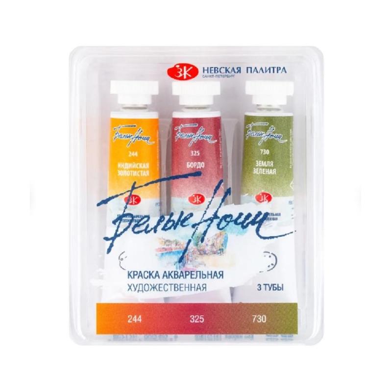 Краски акварельные Белые ночи Пион набор 3 цвета по 10 мл в тубах<br><br>Акварельные краски Белые Ночи предназначены для профессиональных художников, создающих яркие и насыщенные работы. Эти краски подходят как для студийной работы, так и для пленэров. В состав входят тонкодисперсные пигменты и гуммиарабик. Краски безопасны, сертифицированы и соответствуют стандартам ASTMD-4236.<br><br>Набор включает три цвета в тубах по 10 мл: индийская золотистая, бордо, земля зелёная. Тубы упакованы в коррекс. Продукт обеспечивает стабильность цвета и простоту использования.<br><br>Краски обладают высокой концентрацией пигмента и прозрачностью, что позволяет работать тонкими лессировками. Они сохраняют насыщенность даже при значительном разбавлении водой. Этот набор идеален для создания живописных композиций с богатым многообразием оттенков благодаря чистым цветам.<br><br>Продукт удобен для переноса благодаря компактному коррексу. Подходит для профессионалов и любителей. Высокая концентрация пигментов обеспечивает яркость и стабильность оттенков.