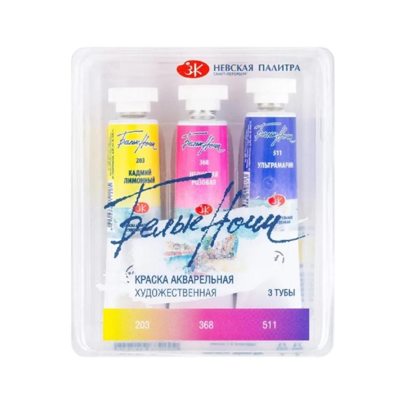 Краски акварельные Белые ночи Флора набор 3 цвета по 10 мл в тубах<br><br>Акварельные краски Белые Ночи предназначены для художников, создающих работы с яркими и насыщенными цветами. Эти краски подходят как для студийной работы, так и для пленэров. В состав входят высококачественные пигменты и гуммиарабик. Краски обладают чистотой цветового тона и мягкой пастозностью.<br><br>Набор включает три цвета в тубах по 10 мл: кадмий лимонный, неоновая розовая, ультрамарин. Тубы упакованы в коррекс. Продукт обеспечивает стабильность цвета и простоту использования.<br><br>Краски быстро смешиваются и легко размываются. Они идеально подходят для выполнения работ больших форматов и техники по-мокрому. Не требуют предварительного размачивания, что делает их удобными для быстрого использования. Этот набор идеален для создания флористических композиций благодаря выбранным оттенкам.<br><br>Продукт удобен для переноса благодаря компактному коррексу. Подходит для профессионалов и любителей. Высокая концентрация пигментов обеспечивает яркость и стабильность оттенков.