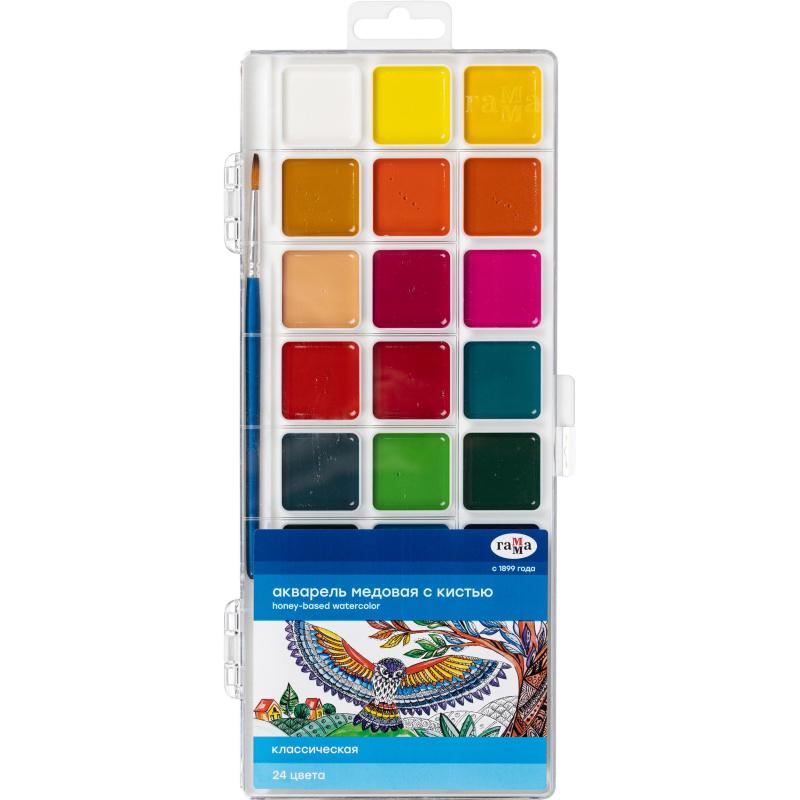 Краски акварельные медовые Гамма Классическая 24 цвета<br><br>Акварельные краски Гамма Классическая на медовой основе в наборе из 24 цветов — это отличное решение для создания ярких и выразительных художественных работ. Краски обеспечивают глубокие, насыщенные цвета и идеальное покрытие благодаря своей медовой основе, которая улучшает сцепление с бумагой и позволяет добиться плавных переходов и ярких оттенков.<br><br>Набор упакован в пластиковый бокс, что делает его удобным для хранения и транспортировки. Общий вес набора составляет 190 г. Краски произведены в России и подходят как для начинающих, так и для более опытных художников, обеспечивая высокое качество и долговечность рисунков.
