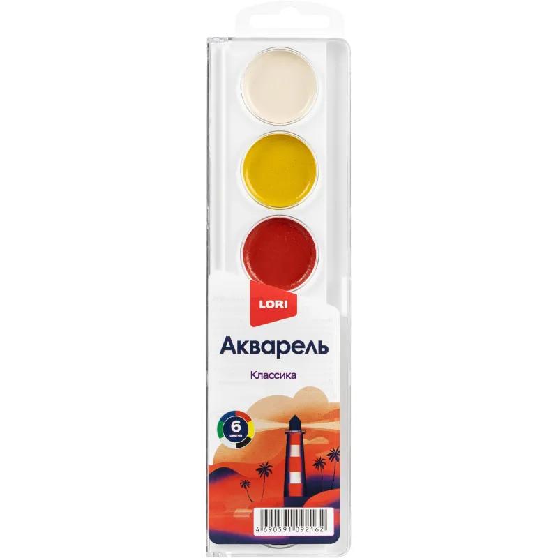 Краски акварельные Lori Классика 6 цветов<br><br>Акварельные краски подойдут для уроков рисования и домашних занятий. В набор входит 6 основных цветов, размещённых в пластиковых кюветах. Краски равномерно ложатся на бумагу, легко разводятся водой и подходят для выполнения простых рисунков и упражнений.<br><br>Цвета: белый, жёлтый, красный, зелёный, тёмно-синий, чёрный.<br><br>Набор упакован в прочный пластиковый бокс, который удобно открывать и хранить. Вес — 50 г.