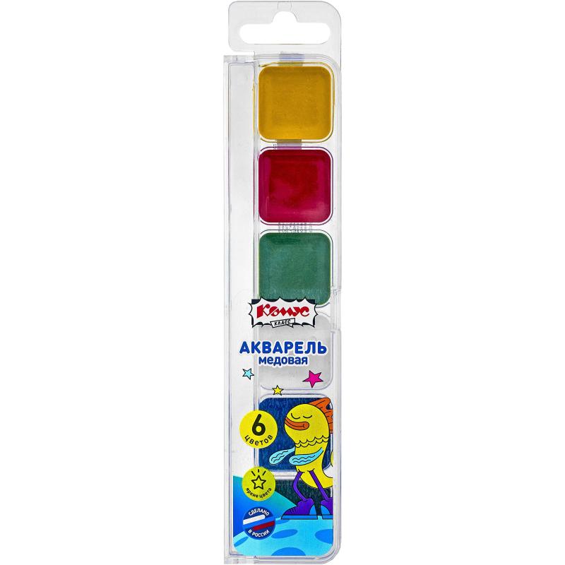 Краски акварельные медовые Комус Класс Максики 6 цветов<br><br>Акварельные медовые краски Комус Класс «Максики» предназначены для занятий рисованием в школе и дома. Палитра из 6 базовых цветов, включая белый, подойдёт для первых художественных шагов ребёнка и помогает осваивать основы цветоведения.<br><br>Краска легко растворяется в воде, равномерно наносится на бумагу, не имеет резкого запаха. В состав входит мёд, который выполняет роль натурального связующего и делает акварель безопасной и экологичной. Акварель полусухая, яркая, с выраженным эффектом прозрачности.<br><br>Набор включает 6 полусухих красок. Кисточка в комплект не входит.<br><br>Краски размещены в пластиковом пенале с прозрачной крышкой. Форма кювет — квадратная. Размер упаковки — 185×39×13,5 мм.