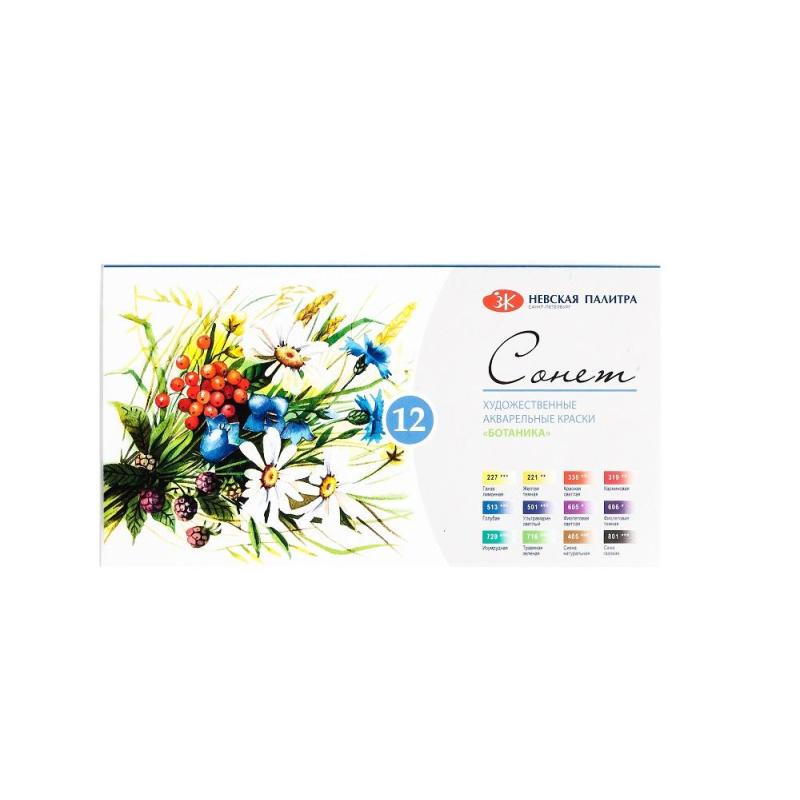Краски акварельные Сонет Ботаника набор 12 цветов по 2.5 мл в кюветах<br><br>Художественные сухие акварельные краски Сонет разработаны для начинающих художников. Эти краски подходят для создания работ с растительными композициями. Изготавливаются по современным рецептам на основе органических пигментов и синтетического связующего. Краски обладают высокой интенсивностью цвета и прозрачностью.<br><br>Набор Ботаника включает 12 цветов. В него входят: ганза лимонная, жёлтая тёмная, красная светлая, карминовая, голубая, ультрамарин светлый, фиолетовая светлая, фиолетовая тёмная, изумрудная, травяная зелёная, сиена натуральная, сажа газовая.<br><br>Краски легко смешиваются, размываются и берутся на кисть. Продукт обеспечивает стабильность цвета и простоту использования. Температура транспортирования и хранения не ниже 0°С.<br><br>Продукт удобен для переноса благодаря компактным размерам упаковки (155×85×20 мм). Подходит для студийной работы и выездов на пленэры. Высокая концентрация пигментов обеспечивает насыщенность цвета. Набор идеален для обучения и практики в живописи.