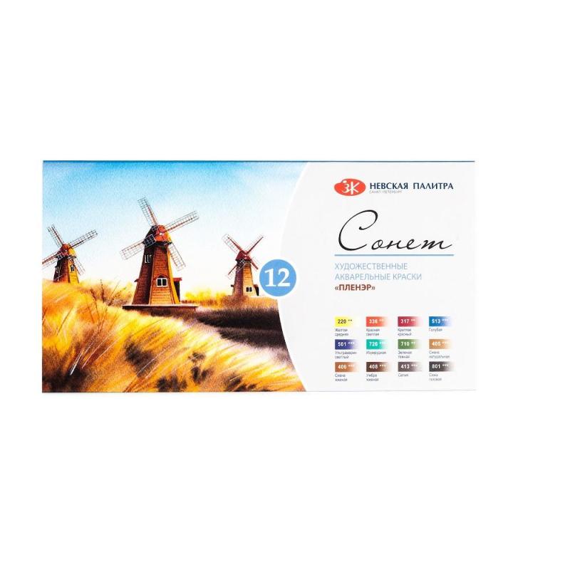 Краски акварельные Сонет Пленэр набор 12 цветов по 2.5 мл в кюветах<br><br>Художественные сухие акварельные краски Сонет предназначены для начинающих художников. Эти краски подходят для создания пленэрных работ на открытом воздухе. Изготавливаются по современным рецептам на основе органических пигментов и синтетического связующего. Краски обладают высокой интенсивностью цвета и прозрачностью.<br><br>Набор Пленэр включает 12 цветов. В него входят: жёлтая средняя, красная светлая, краплак красный, голубая, ультрамарин светлый, изумрудная, зелёная тёмная, сиена натуральная, сиена жжённая, умбра жжённая, сепия, сажа газовая.<br><br>Краски легко смешиваются, размываются и берутся на кисть. Продукт обеспечивает стабильность цвета и простоту использования. Температура транспортирования и хранения не ниже 0°С.<br><br>Продукт удобен для переноса благодаря компактным размерам упаковки (15.5×8.5×2 см). Подходит для студийной работы и пленэров. Высокая концентрация пигментов обеспечивает насыщенность цвета. Набор идеален для обучения и практики в живописи.