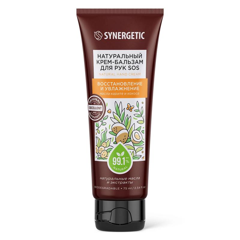 Крем-бальзам для рук Synergetic SOS восстановление и увлажнение 75 мл<br><br>Натуральный крем-бальзам для рук Synergetic SOS восстановление и увлажнение комплексно регенерирует и интенсивно питает кожу рук, моментально возвращая ей невероятную мягкость и эластичность. Нежная текстура и активная формула способствуют экспресс уходу и восстановлению. Натуральный пребиотик и природный антиоксидант трегалоза нормализует и сохраняет естественный микробиом кожи. Бисаболол успокаивает и помогает восстановить барьерные функции кожи, снимает раздражения и покраснения, повышает упругость, способствует более глубокому проникновению активных веществ в глубокие слои кожи. Масла карите, кокоса и оливы помогают сохранять баланс влаги, насыщают кожу полезными микроэлементами, глубоко и длительно увлажняют, придают эластичность и шелковистую гладкость, защищают от воздействия факторов внешней среды. Экстракт бергамота сужает поры, устраняет воспаление и раздражение, отлично тонизирует и освежает, улучшая состояние и выравнивая цвет кожи. Продукт дерматологически протестирован на чувствительной коже независимым институтом в Германии. Крем не содержит парабенов, минеральных масел, силиконов и красителей, не тестируется на животных и сертифицирован британской организацией The Vegan Society. Знак Vegan — мировой стандарт этичной продукции.<br><br>Способ применения: нанести на чистую сухую кожу. Меры предосторожности: при попадании в глаза, промыть водой. Только для наружного применения. Хранить отдельно от еды.<br><br>Состав: Aqua, Glycerinx, Butyrospermum Parkii Butterx (масло карите), Caprylic / Capric Triglyceridex, Potassium Cetyl Phosphatex, Behenyl Alcoholx, Isoamyl Lauratex, Stearic Acidx, Palmitic Acidx, Cetearyl Alcoholx, Glyceryl Stearatex, Betainex, Cetyl Estersx, Coco-Caprylate / Capratex, Cocos Nucifera Oilx (масло кокоса), Citrus Aurantium Bergamia Fruit Extractx (экстракт бергамота), Olive Oil Polyglyceryl-4 Estersx (масло оливы), Saccharide Isomeratex, Trehalosex, Sodium PCAx, Bisabololx, Sorbitan Caprylatex, Propanediolx, Xanthan Gumx, Parfum, Benzoic Acidx, Sodium Benzoatex, Potassium Sorbatex, Citric Acidx, Sodium Citratex, Potassium Hydroxidex.