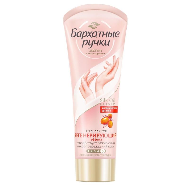 Крем для рук Бархатные ручки Регенерирующий эффект 80 мл<br><br>Крем разработан специально для кожи рук, требующей особого интенсивного ухода. Компоненты в составе крема активируют восстановление клеток, обеспечивая профилактику появления мелких трещинок. Кожа рук ежедневно испытывает колоссальное воздействие разрушающих стресс-факторов. Регулярное применение крема для рук, не менее 2 раз в день, восполняет ресурсы кожи, защищая её от микроповреждений. Формула Silk Oil Elexir представляет собой комплекс, состоящий из микромасел и протеинов шёлка. Благодаря своему размеру (до 10 мкм), эти частицы масел способны проникать внутрь эпидермиса, не нарушая липидный барьер, и доставлять питательные вещества клеточкам кожи. Масло облепихи укрепляет стенки кровеносных сосудов и делает их менее проницаемыми, улучшает тканевой обмен веществ, обладает антиоксидантным действием. Аргинин — это аминокислота, способствующая клеточному делению, служит строительным материалом для производства белков. Аргинин необходим для синтеза креатина. Глицерин оказывает смягчающее действие на кожу, увлажняет её. Небольшие по размеру молекулы глицерина способны преодолевать липидный барьер кожи и проникать в глубокие слои эпидермиса. Мочевина — увлажняющий компонент, подходит для сухой, чувствительной кожи.<br><br>Способ применения: наносите крем на чистую, сухую кожу лёгкими массирующими движениями.<br><br>Состав: Aqua, Glycerin, Urea, Dimethicone, Zea Mays (Corn) Oil, Polyglyceryl-3 Methylglucose Distearate, Caprylic/Capric Triglyceride, Cetearyl Alcohol, Glyceryl Stearate, Prunus Amygdalus Dulcis (Sweet Almond) Oil, Cyclopentasiloxane, Acrylates/C10-30 Alkyl Acrylate Crosspolymer, Butyrospermum Parkii (Shea Butter), Allantoin, Arginine, Caprylyl Glycol, Dimethyl Sulfone, Disodium EDTA, Ethylparaben, Hippophae Rhamnoides Fruit Juice, Hippophae Rhamnoides Oil, Hydrolyzed Silk, Methylparaben, Niacinamide, Phenoxyethanol, Potassium Sorbate, Potassium Cetyl Phosphate, Parfum, Alpha-Isomethyl Ionone, Benzyl Salicylate, Butylphenyl Methylpropional, Citral, Citronellol, Hexyl Cinnamal, Limonene, Linalool.