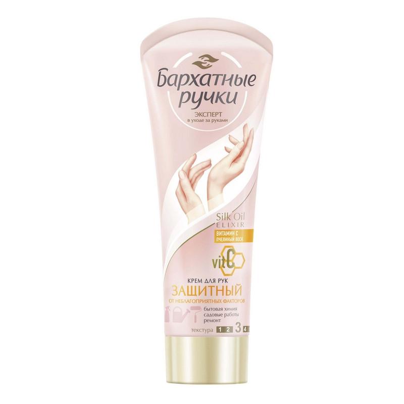 Крем для рук Бархатные ручки Защитный 80 мл<br><br>Специальная формула крема разработана для защиты кожи рук от влияния внешних факторов (ветер, холод, сухой воздух). Комплекс эффективно действующих компонентов обладает восстанавливающим действием, смягчает кожу, предотвращает появление сухости и шелушения. Действие крема усилено формулой Silk oil elixir. Микро-масла восстанавливают клетки кожи, и в комплексе с протеинами шёлка делают её мягкой и нежной. Красота и нежность Ваших рук в каждом прикосновении!<br><br>Способ применения: наносите на чистую сухую кожу, легко массируя до полного впитывания. Используйте по мере необходимости.<br><br>Состав: Aqua, Caprylic/Capric Triglyceride, Cyclopentasiloxane, sopropyl Isostearate, Isopropyl Myristate, Ethylhexyl Stearate, Glycerin, Glyceryl Stearate, Citrate, PEG-12, Dimethicone, Prunus Amygdalus Dulcis (Sweet Almond) Oil, Glyceryl Stearate, Butyrospermum Parkii (Shea Butter), Cetearyl Alcohol, Potassium Cetyl Phosphate, Betaine, Disodium Cetearyl Sulfosuccinate, Acrylates/C10-30 Alkyl Acrylate Crosspolymer, Triethanolamine, Hydrolyzed Silk, Tocopheryl Acetate, Sodium Ascorbyl Phosphate, Maris Sal, Propylen Glycol, Sorbitol, Carboxymethyl Chitin Liquid, Panthenol, Sodium Hyaluronate,PEG-40 Hydrogenated Castor Oil, Disodium EDTA, Methyparaben, Ethylparaben, DMDM Hydantoin, Phenoxyethanol, Potassium Sorbate, Parfum, Hydroxyisohexyl 3-Cyclohexene Carboxaldehyde.