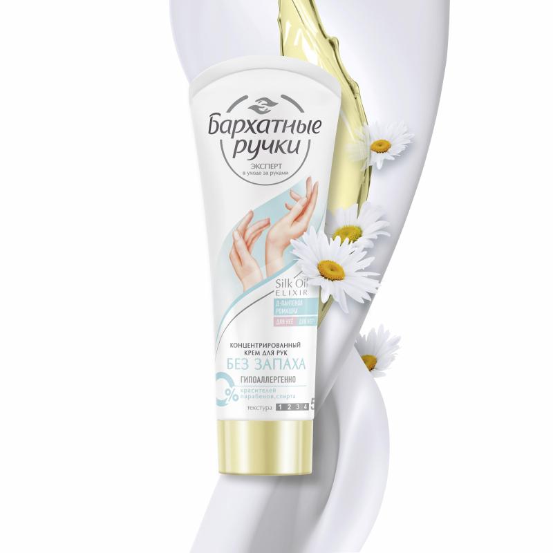 Крем для рук Бархатные ручки без запаха увлажняющий 72 мл<br><br>Бренд Бархатные Ручки представляет крем для рук без запаха. Сухая и чувствительная кожа рук требует специального и бережного ухода. Интенсивный крем с формулой Silk Oil Elixir, усиленной пантенолом и ромашкой, разработан специально для быстрого восстановления сухой и чувствительной кожи рук.<br><br>Отдушки могут являться катализатором аллергии. Многие потребители не могут использовать крема с ярко-выраженным запахом из-за аллергической реакции. Крем Бархатные ручки не содержит отдушки и является гипоаллергенным, подходит для использования в сезон аллергии. Продукт рекомендован дерматологами и аллергологами.<br><br>Крем обладает густой и ультра насыщенной текстурой, но при этом быстро впитывается без липкости и жирности. Текстура крема без запаха самая насыщенная и концентрированная в основной линейке бренда Бархатные ручки.<br><br>Крем для рук Бархатные ручки полностью подходит для использования для неё и для него. Универсальная формула крема полностью подходит как для женской, так и для мужской кожи рук.<br>Формула продукта содержит 100% полезные компоненты, без красителей, парабенов, спирта, что снижает вероятность возникновения неприятных ощущений и возникновения аллергической реакции. Крем укрепляет собственный защитный барьер чувствительной кожи для предотвращения воздействия внешних агрессивных факторов.<br><br>Формула продукта содержит Д-Пантенол и Ромашку:<br>Д-пантенол восстанавливает и увлажняет сухую, чувствительную кожу рук;<br>Ромашка успокаивает сухую и чувствительную кожу рук. Снимает признаки раздражения и шелушения кожи.<br><br>Способ применения: наносите на чистую сухую кожу, легко массируя.<br><br>Состав: Aqua, Cetearyl Alcohol,C12-15 Alkyl Benzoate, Glycerin, Glyceryl Stearate Citrate, Potassium Cetyl Phosphate, Prunus Amygdalus Dulcis (Sweet Almond) Oil, Urea, Chamomilla Recutita (Matricaria) Flower/Leaf Extract (экстракт ромашки), Hydrolyzed Silk Extract, Inulin, Panthenol (пантенол), Allantoin, Caprylyl Glycol, Dipropylene Glycol, Disodium EDTA, Glyceryl Caprylate, Glycine Soja (Soybean) Oil, Hydroxyacetophenone, Niacinamide, Pantolactone.