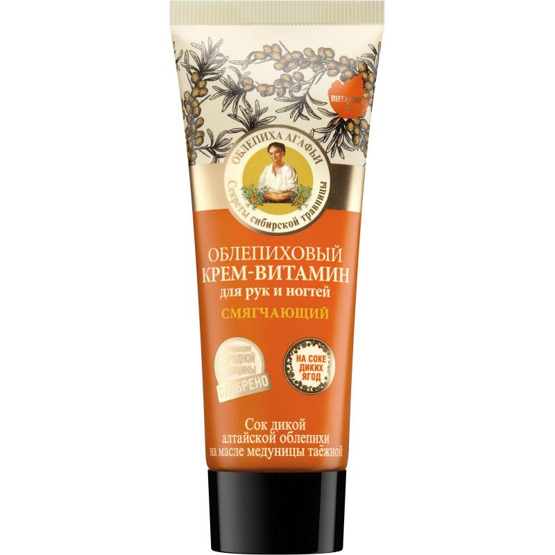 Крем для рук и ногтей Рецепты бабушки Агафьи Облепиховый смягчающий 75 мл<br><br>Облепиховый крем-витамин обладает смягчающим эффектом, питает кожу рук и укрепляет ногти. Сок дикой алтайской облепихи обогащает кожу витаминами и питательными веществами, защищает от негативных факторов окружающей среды. Масло медуницы таёжной насыщает кожу влагой, устраняет сухость и шелушение. Органическое масло семян сибирской смородины содержит в своём составе незаменимые жирные кислоты омега-6 и омега-3, благодаря чему ухаживает за кутикулой и разглаживает кожу.<br><br>Способ применения: нанесите небольшое количество крема на сухую чистую кожу рук мягкими массирующими движениями.<br><br>Состав: Aqua with infusions of Hippophae Rhamnoides Fruit Juice (сок ягод дикой алтайской облепихи); Cetearyl Alcohol, Isopropyl Palmitate, Stearic Acid, Palmitic Acid, Helianthus Annuus Seed Oil, Elaeis Guineensis Oil, Pulmonaria Officinalis Extract (масляный экстракт таёжной медуницы), Ribes Nigrum Seed Oil (органическое масло семян сибирской смороды), Tocopheryl Acetate (витамин Е), Sodium Cetearyl Sulfate, Xanthan Gum, Benzyl Alcohol, Benzoic Acid, Sorbic Acid, Citric Acid, Parfum.