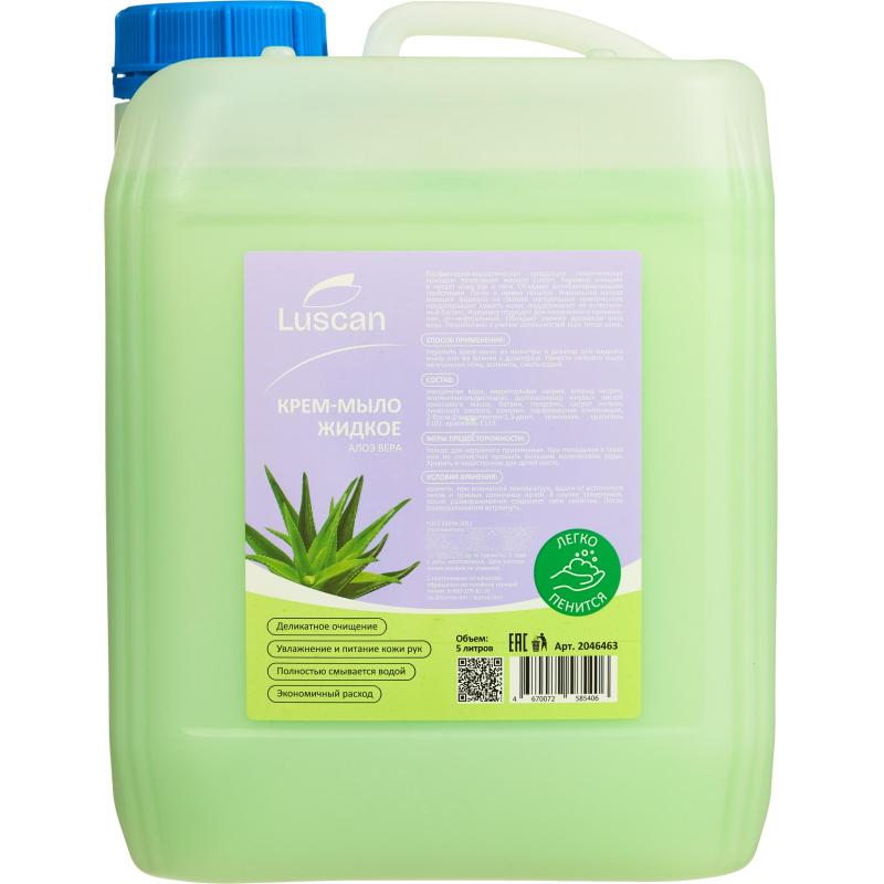 Крем-мыло косметическое Luscan Алоэ вера 5000 мл<br><br>Назначение: крем-мыло бережно очищает и питает кожу рук и тела. Обладает антибактериальными свойствами. Легко и нежно пенится. Уникальная мягкая моющая формула на основе натуральных компонентов предотвращает сухость кожи, поддерживает её естественный баланс. Идеально подходит для ежедневного применения. pH-нейтральный. Обладает свежим ароматом алоэ вера. Разработано с учётом особенностей всех типов кожи.<br>Способ применения: перелить крем-мыло из канистры в диспенсер для жидкого мыла или во флакон с дозатором. Нанести немного мыла на влажную кожу, вспенить, смыть водой.<br>Меры предосторожности: только для наружного применения. При попадании в глаза или на слизистые промыть большим количеством воды. Хранить в недоступном для детей месте, при комнатной температуре, вдали от источников тепла и прямых солнечных лучей. В случае замерзания, после размораживания сохраняет свои свойства. После размораживания встряхнуть.<br>Состав: очищенная вода, лауретсульфат натрия, хлорид натрия, этиленгликольдистеарат, диэтаноламид жирных кислот кокосового масла, бетаин, глицерин, цитрат натрия, лимонная кислота, ланолин, парфюмерная композиция, 2-бром-2-нитропропан-1,3-диол, триклозан, краситель Е102, краситель Е133.<br>Срок годности: 3 года с даты изготовления.