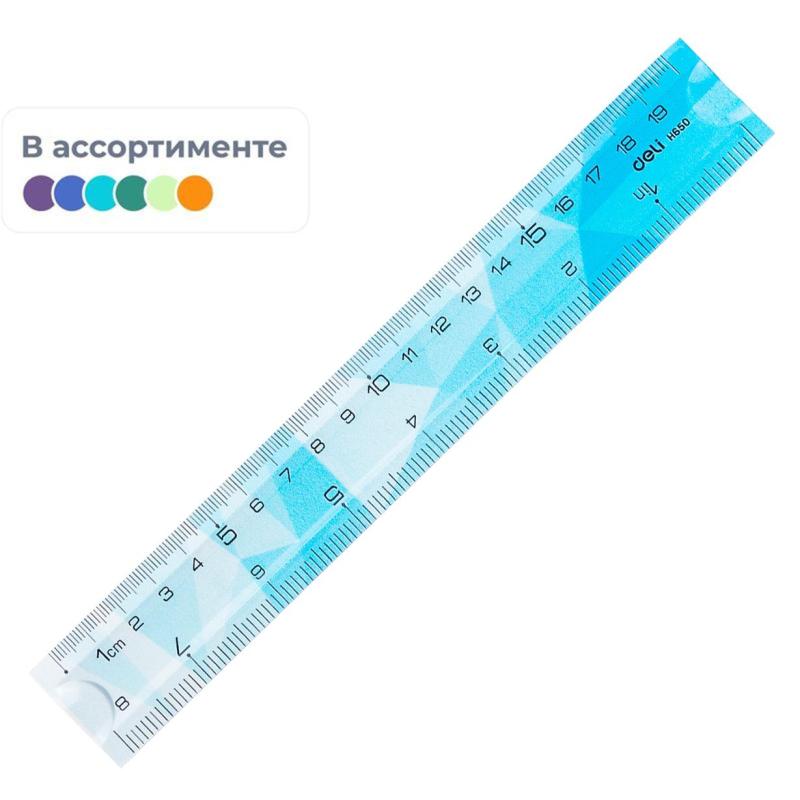 Линейка Deli 20 см пластиковая в ассортименте гибкая <br><br>Линейка является незаменимым помощником при чертежных работах в образовательных учреждениях и офисах, а также дома.<br>Выполнена из неломающегося гнущегося пластика.<br>Можно сгибать и скручивать неограниченное количество раз.<br>Можно использовать как антистресс! <br>Двойная высококачественная градуировка: деления наносятся с использованием специальных чернил для оптимальной стойкости.<br>Легко читать: наглядные индикаторы каждые 5 см. <br><br>Внимание! Товар поставляется в нескольких вариантах цвета/дизайна (без возможности выбора).