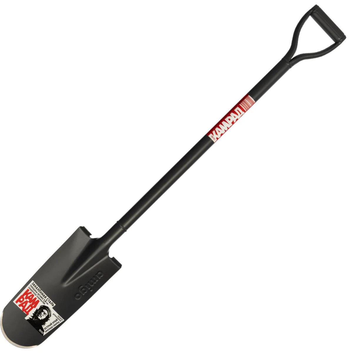 Лопата металлическая штыковая Amigo grande Камрад — специализированный инструмент с узким закалённым стальным штыком и острой заточенной рабочей кромкой, предназначенный для копки дренажных канав, пересадки растений и перекапывания в труднодоступных местах в тяжёлых почвах. Толщина штыка составляет 1.8 мм, а его прочная сварная конструкция с роботизированной герметичной сваркой обеспечивает надёжность при эксплуатации. Стальной черенок толщиной стенки 1.2 мм отличается высокой устойчивостью к нагрузкам на излом, оснащён заглушкой для защиты от попадания грунта и удобной V-образной стальной рукояткой. Антикоррозийное порошковое покрытие защищает инструмент от внешних воздействий. <br>Габаритные размеры: общая длина — 120 см, длина штыка — 33.5 см, ширина штыка — 13.5 см.