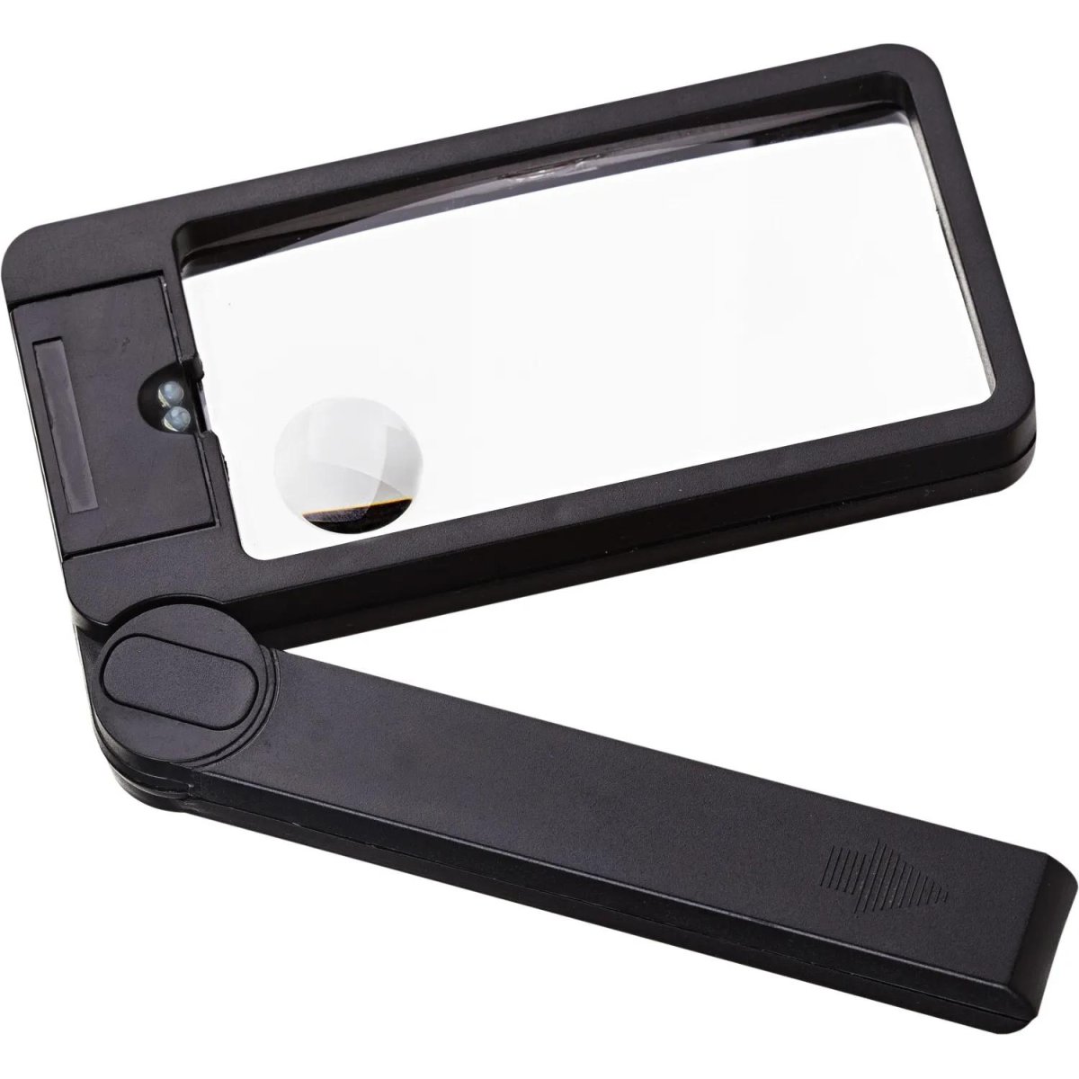 Лупа Attache Selection с <nobr>2-кратным</nobr> увеличением, встроенной линзой с <nobr>4х-кратным</nobr> увеличением, диодной подсветкой и складной ручкой. Лупа имеет прямоугольную форму: Размер в сложенном состоянии: 124×80×16.3 мм Размер увеличительного стекла: 96×50 мм Имеет встроенную диодную подсветку (2 диода), питание от двух батареек ААА. <BR><BR><b>Обращаем Ваше внимание, что батарейки не идут в комплекте с лупой. Подходящие к данному товару элементы питания Вы можете выбрать в разделе 'Расходные материалы'.<b>