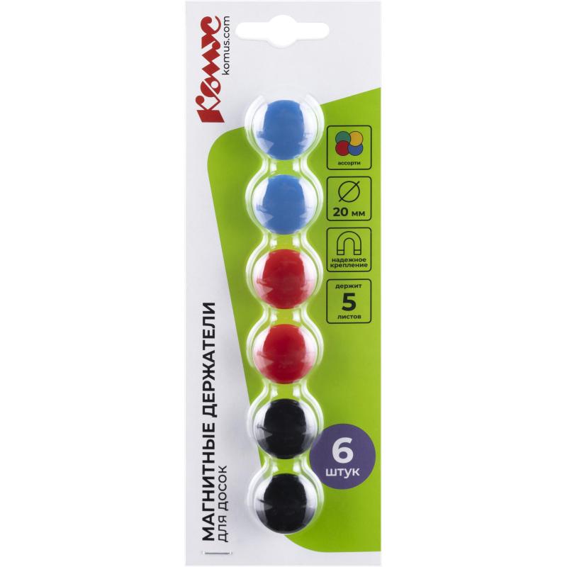 Магнитные держатели для досок марки Комус — это надежные и удобные аксессуары для фиксирования листов бумаги к магнитной поверхности белых досок, флипчартов и других подобных поверхностей. Они прочно держат листы бумаги на месте, не позволяя им соскальзывать или падать. В упаковке поставляется 6 магнитных держателей трех цветов по 2 штуки каждого цвета (синий, красный, черный) для наглядности работы с информацией. Материал: качественный пластик, сталь. Упаковка в виде блистера компактна и практична. Магниты имеют удобный диаметр 20 мм, что позволяет не загораживать информацию на бумаге и обеспечивает компактное хранение и расположение на доске или другой рабочей поверхности.