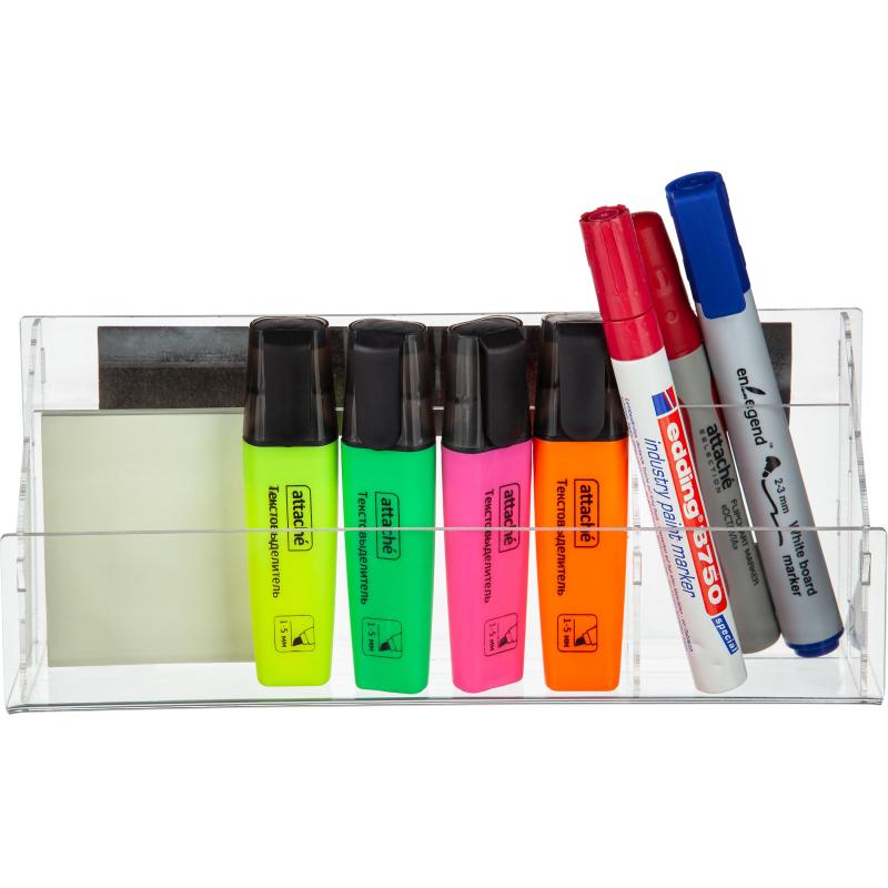 Держатель для маркеров из прозрачного оргстекла, два отделения для маркеров и магнитов. Подходит только для магнитно маркерной доски. Размер держателя 240×100×53 мм. Ширина отсека под маркеры 170 мм, ширина отсека под губку 70 мм. Подходят все маркеры, универсальный отсек, специальная планка защищает от выпадания (расположена на высоте 6–8 см). В комплекте магнитное крепление.