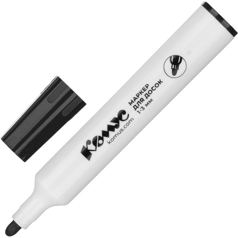 Маркер для досок Комус в прочном пластиковом корпусе. Чернила на спиртовой основе, не содержат ксилол и толуол. Идеально подходит для надписей на белых досках с магнитно—маркерной поверхностью. Надписи можно легко стереть сухой губкой. Прочный акриловый наконечник круглой формы позволяет провести линию толщиной от 1 до 3 мм. Цвет — черный. Длина линии письма — 300 м. Изделие не перезаправляется.<BR><BR>Внимание! Маркеры для досок необходимо хранить в горизонтальном положении или фетром вниз.