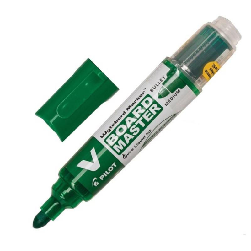 Маркер для досок PILOT WBMA-<nobr>VBM-M-BG</nobr> Маркер для белых эмалевых досок. Скошенный наконечник. Пластиковый корпус. Толщина линии письма — 1–3 мм. Цвет: зеленый. Продукт серии Begreen, на 91% изготовлен из вторично переработанного пластика. Система визуального контроля наличия чернил. Жидкие чернила на спиртовой основе. Нетоксичны, не содержат ксилен.<BR><BR>Внимание! Маркеры для досок необходимо хранить в горизонтальном положении или фетром вниз.