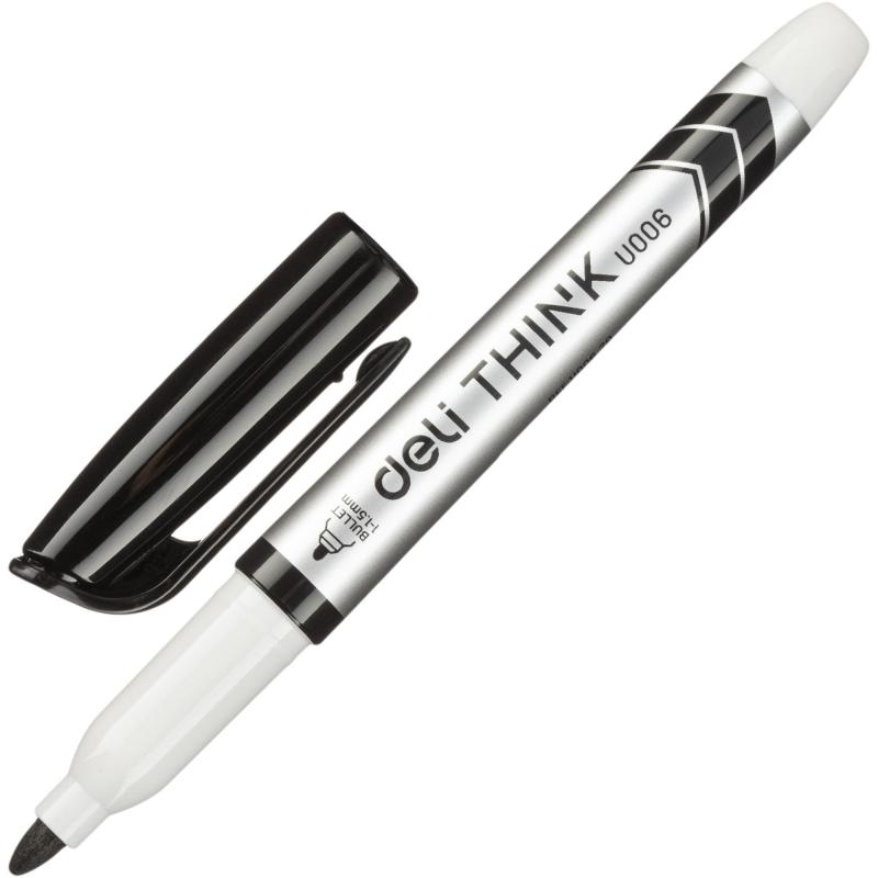 Маркер для белой доски Deli Think для повседневного использования. Идеален для использования на школьных занятиях и детского творчества на белых досках с магнитно-маркерной поверхностью.<br><br>Тонкий круглый войлочный наконечник позволяет оставлять за собой след от 1 мм до 1.5 мм, а удобный и надежный колпачок облегчит хранение. Эластичный наконечник обладает повышенной износостойкостью и обеспечивает экономный расход чернил. Маркер пишет ярко и сочно. Маркер абсолютно безопасен для Вашего здоровья и окружающей среды. Корпус произведен из экологичного пластика, созданного из переработанного сырья, что позволяет бережно относиться к природе. Маркер для белых досок легко стирается не оставляет следов на поверхности.<br><br>Маркер канцелярский не перезаправляется. Цвет колпачка с клипом соответствует цвету чернил. Маркер для доски используют в каждом офисе, детском саду, школе, медицинских центрах, на производстве и во многих других учреждениях. Будет прекрасным и нужным подарком для учителя, врача, офисного работника.<br>Цвет: черный.<br>Количество в упаковке: 12 штук.<br>Материал корпуса: пластик.<br>Основа чернил: спиртовая.<br>Форма наконечника: круглый.<br><br>Внимание! Маркеры для досок необходимо хранить в горизонтальном положении.