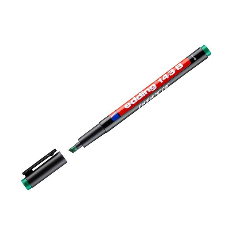 Маркер промышленный перманентный Edding 143/4 для глянцевых поверхностей зелёный 1 мм<br><br>Маркер предназначен для перманентной маркировки на различных гладких поверхностях, таких как пластик, стекло, металл, дерево, картон и бумага. Он идеально подходит для создания чётких и долговечных надписей, особенно на таких материалах, как пластиковые папки, файлы и проекторные плёнки.<br><br>Маркер оснащён круглым наконечником диаметром 1 мм, что позволяет наносить точные линии. Чернила быстро сохнут, являются водостойкими и гарантируют долговечность маркировки. Температура маркировки: от −10°C до +50°С. Температура поверхности: от 0°С до + 40°С.<br><br>Маркер не устойчив к кислотам, растворителям и не предназначен для использования на загрязнённых поверхностях. Он не обладает устойчивостью к воздействию погодных условий, но остаётся отличным выбором для работы с гладкими поверхностями внутри помещений.<br><br>Инструкция по применению маркера: перед использованием встряхнуть маркер с закрытым колпачком, затем надавить на наконечник, чтобы краска начала поступать, и аккуратно нанести её на поверхность. После использования маркер следует плотно закрыть.