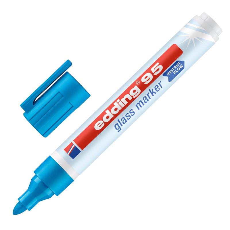 Маркер для стеклянных досок в пластиковом корпусе. Конусообразный наконечник обеспечивает толщину линии от 1.5 до 3 мм. Цвет — голубой.<BR><BR><BR>Особенности:<BR><BR>— Для всех окрашенных стеклянных досок и большинства стеклянных поверхностей<BR><BR>— Блестящие светостойкие чернила ложатся плотным слоем<BR><BR>— Легко удалить сухим способом даже спустя несколько недель<BR><BR>— С системой подкачки чернил.<br><br>Инструкция по применению маркера:<br>1. Перед использованием тщательно встряхните маркер с закрытым колпачком.<br>2. Снимите колпачок, прижмите наконечник к поверхности и надавите, удерживая до появления краски.<br>3. Убедитесь, что вытекает нужный цвет, прежде чем начать рисовать или писать.<br>Предостережение: плотно закрывайте колпачок после использования и храните маркер вдали от огня и прямых солнечных лучей.<BR>Чернила на спиртовой основе.