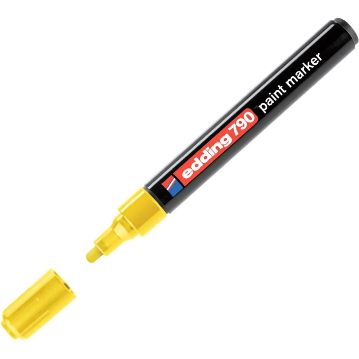 Маркер промышленный лаковый Edding E-790/5 жёлтый 2-4 мм<br><br>Маркер с жёлтыми лакирующими чернилами предназначен для универсальной промышленной маркировки. Он используется для нанесения заметных и стойких надписей на различных материалах, включая стекло, пластик, металл, дерево, резину, картон и бетон. Этот маркер отлично подходит для работы на жирных, пыльных и грязных поверхностях, что делает его идеальным для применения в сложных индустриальных условиях.<br><br>Маркер оснащён упрочнённым круглыми (пулевидными) наконечниками, что позволяет наносить точные линии толщиной от 2 до 3 мм. Поток чернил регулируется клапаном, что обеспечивает равномерное нанесение. Чернила быстро сохнут, водостойкие и имеют высокую термостойкость. Температура маркировки: от −80°С до +400°С. Температура поверхности: от — 15°С до + 95°С.<br><br>Маркер Edding 790 применим для различных отраслей, таких как приборостроение, технологическая маркировка, а также для декоративных и оформительских работ, например, витражных и росписи по дереву и керамике. Корпус маркера выполнен из пластика, что делает его более экономичным вариантом среди аналогичных маркеров.<br><br>Перед использованием маркера следует тщательно встряхнуть его с закрытым колпачком, затем прижать наконечник к поверхности и удерживать до появления краски. После применения важно плотно закрывать колпачок и хранить маркер вдали от огня и солнечных лучей.
