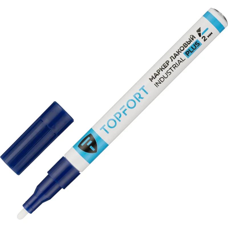 Маркер промышленный лаковый TOPFORT Industrial Plus для агрессивной среды синий 1-2 мм (2096984)<br><br>Маркер промышленный TOPFORT Industrial для универсальной маркировки синий (2 мм) предназначен для промышленной непрозрачной маркировки металла, стекла, пластика, дерева, резины, камня, картона, кирпича, текстиля, кожи (материал), бумаги, бетона. Краска содержит высококонцентрированный пигмент, хорошо ложится на гладкие и шероховатые поверхности. Может применяться для письма на жирных, пыльных, грязных поверхностях. После высыхания лаковые чернила устойчивы к воздействию света, атмосферных осадков, смазочных материалов, механическому истиранию. Создаёт стойкую линию толщиной 2 мм. Длина маркера — 143 мм. Цвет чернил : синий.<br>Особенности:<br>— Краска на усиленной масляной основе (Италия).<br>— Устойчивый к износу усиленный акриловый круглый наконечник (Япония).<br>— Толщина линии 2 мм.<br>— Материал корпуса — алюминий.<br>— Температурный режим использования : от 0 до +40 °С.<br>— Температурный режим хранения: от 0 до +60 °С.<br>— Температурная устойчивость надписи: от −60 до +350 °С.<br><br>Инструкция по применению:<br>1. Перед использованием интенсивно встряхните маркер с закрытым колпачком.<br>2. Снимите колпачок, прижмите наконечник к поверхности, надавите до упора и удерживайте пока не проступит краска.<br>3. Применять после того как убедитесь, что наконечник полностью пропитан краской исходного цвета. Избегайте чрезмерного давления на наконечник при дальнейшем использовании.<br><br>Предостережения: плотно закрывайте колпачок после применения, держать маркер вдали от источников тепла и воспламенения.