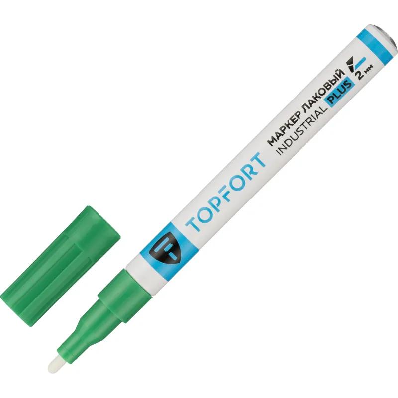 Маркер промышленный лаковый TOPFORT Industrial Plus для агрессивной среды зелёный 1-2 мм (2096985)<br><br>Маркер промышленный TOPFORT Industrial для универсальной маркировки зелёный (2 мм) предназначен для промышленной непрозрачной маркировки металла, стекла, пластика, дерева, резины, камня, картона, кирпича, текстиля, кожи (материал), бумаги, бетона. Краска содержит высококонцентрированный пигмент, хорошо ложится на гладкие и шероховатые поверхности. Может применяться для письма на жирных, пыльных, грязных поверхностях. После высыхания лаковые чернила устойчивы к воздействию света, атмосферных осадков, смазочных материалов, механическому истиранию. Создаёт стойкую линию толщиной 2 мм. Длина маркера — 143 мм. Цвет чернил : зелёный.<br>Особенности:<br>— Краска на усиленной масляной основе (Италия).<br>— Устойчивый к износу усиленный акриловый круглый наконечник (Япония).<br>— Толщина линии 2 мм.<br>— Материал корпуса — алюминий.<br>— Температурный режим использования : от 0 до +40 °С.<br>— Температурный режим хранения: от 0 до +60 °С.<br>— Температурная устойчивость надписи: от −60 до +350 °С.<br><br>Инструкция по применению:<br>1. Перед использованием интенсивно встряхните маркер с закрытым колпачком.<br>2. Снимите колпачок, прижмите наконечник к поверхности, надавите до упора и удерживайте пока не проступит краска.<br>3. Применять после того как убедитесь, что наконечник полностью пропитан краской исходного цвета. Избегайте чрезмерного давления на наконечник при дальнейшем использовании.<br><br>Предостережения: плотно закрывайте колпачок после применения, держать маркер вдали от источников тепла и воспламенения.