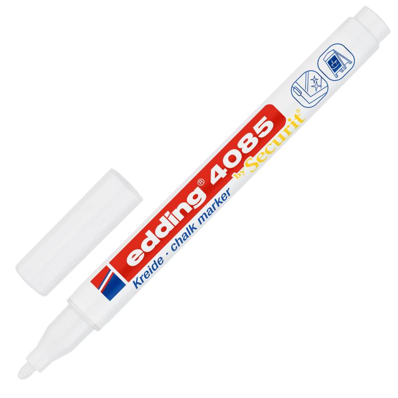 Меловой маркер edding 4085. Цвет белый. Предназначен для нанесения рисунков и надписей на гладкие поверхности, такие как стекло, кафель, пластик, меловые доски (в том числе черные). Легко стираются влажной салфеткой. <br>Чернила этого маркера — ни что иное, как жидкий мел на водной основе без каких-либо примесей, поэтому данный маркер прекрасно подходит для детей. Edding 4085 — отличный инструмент для воплощения творческих идей дома, но так же рекомендуется для использования в офисах, ресторанах, стекольной и других видах промышленности. <br>Уникальная особенность серии edding 4085 — наличие необычных цветов и тонкая линия письма — всего 1–2 мм, что является большой редкостью для меловых маркеров. Форма наконечника: круглая.<br><br>Инструкция по применению маркера:<br>1. Перед использованием тщательно встряхните маркер с закрытым колпачком.<br>2. Снимите колпачок, прижмите наконечник к поверхности и надавите, удерживая до появления краски.<br>3. Убедитесь, что вытекает нужный цвет, прежде чем начать рисовать или писать.<br>Предостережение: плотно закрывайте колпачок после использования и храните маркер вдали от огня и прямых солнечных лучей.