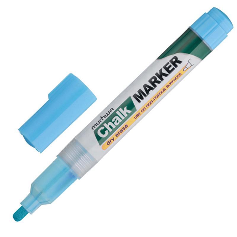 Меловой маркер MunHwa Chalk Marker — жидкий мел маркер на спиртовой основе. Круглая форма наконечника. Используется для декорирования зеркал и стекол, оформления окон, для надписей на металле и пластике.<BR>Маркеры, нанесенные на гладкую поверхность, легко удаляются сухой тканью не оставляя разводов.<BR>Меловой маркер устойчив к умеренным осадкам. После нанесения образует тонкую пленку на поверхности.<BR>Благодаря высококачественным чернилам, мел поступает дозированно, ложится на поверхность равномерным и однородным слоем, полностью закрашивая обрабатываемую поверхность. Меловой маркер — не крошится, не осыпается при нанесении и не пачкает руки. Клапанный механизм пишущего узла исключает растекание и разбрызгивание мела, преждевременное пересыхание маркера. Толщина линии письма — 3 мм. Нежный голубой цвет чернил.<BR>Меловой маркер MunHwa «Chalk Marker» — это твой помощник для воплощения всех креативных решений в жизнь.<BR>Инструкция по применению:<BR>1) Встряхнуть маркер с закрытым колпачком.<BR>2) Открыть колпачок. Удерживая маркер в вертикальном положении, несколько раз надавить стержнем на поверхность до тех пор, пока краска не поступит на пишущих узел.<BR>3) Выполнить надпись или рисунок. Дать составу высохнуть в течение 30–40 секунд.<BR>4) Плотно закрыть колпачок. <br><br>Перед использованием маркера требуется произвести его активацию в соответствии с инструкцией.