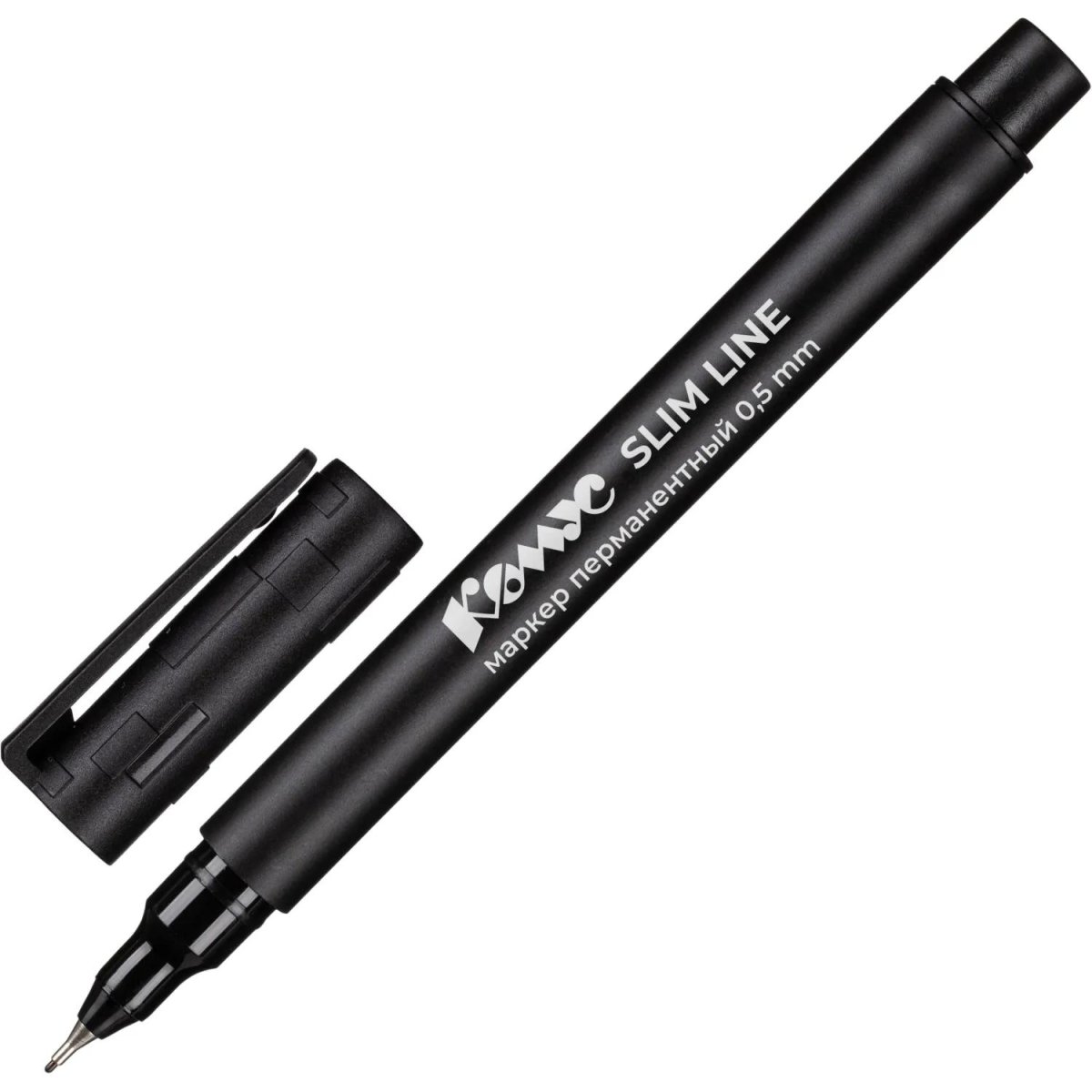 Маркер перманентный Комус Slim Line чёрный игольчатый наконечник (толщина линии 0.5 мм)<br><br>Маркер перманентный предназначен для нанесения надписей на различных поверхностях. Чернила чёрного цвета на спиртовой основе отличаются водостойкостью и сохраняют чёткость линий.<br>Игольчатый наконечник из металлополимерной смолы обеспечивает толщину штриха 0.5 мм, что подходит для аккуратных и детализированных записей. Корпус выполнен из пластика круглой формы, колпачок оснащён клипом для удобного крепления.<br>Маркер произведён в Китае и имеет европейский патент.