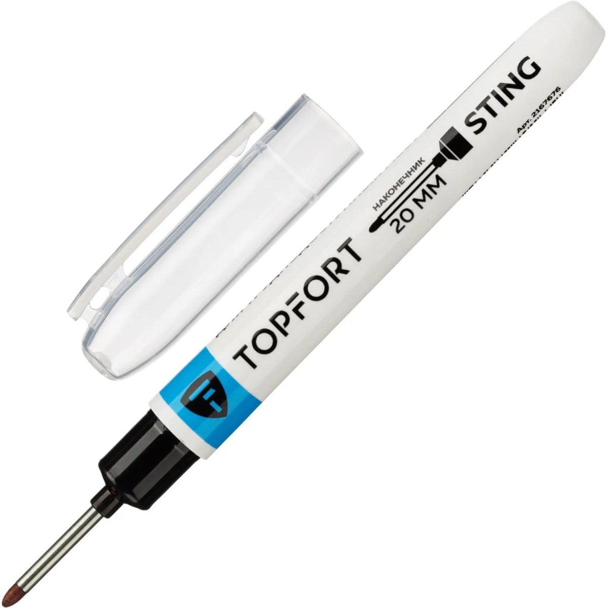 Маркер промышленный перманентный TOPFORT для труднодоступных мест чёрный 1 мм (2167676)<br><br>Маркер промышленный для труднодоступных мест идеально подходит для нанесения маркировки для разметки позиций для сверления под крепёж, под электропроводку благодаря специально спроектированному очень длинному и тонкому пишущему узлу длиной 20 мм и тонкому круглому наконечнику. Корпус специального промышленного маркера для отверстий и труднодоступных мест изготовлен из прочного пластика. Активно используется при сборке изделий на объекте, маркировки труднодоступных мест, сборке мебели. Подходит для работ по следующим поверхностям: бетон, бумага, дерево, камень, картон, кафель, керамика, шины, ткань, стекло, резина, плёнка, пластик, металл. Поверхности для маркировки должны быть сухие и чистые, без пыли. Пишущий узел маркера изготовлен так, что при письме не требует сильного нажатия. Надпись устойчива к выгоранию, к смыванию водой. Чернила быстросохнущие, практически без запаха, не содержат толуол и ксилол.