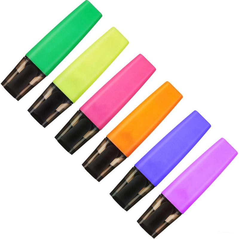 Классические текстовыделители предназначены для работы на всех типах бумаги. В наборе 6 цветов: желтый, зеленый, оранжевый, розовый, голубой, фиолетовый. Скошенный наконечник имеет толщину линии письма от 1 до 5 мм — широкая часть удобна для выделения текста, а тонкая — для подчеркивания. Чернила на водной основе быстро сохнут и не оставляют разводов. Цвет корпуса соответствует цвету чернил.
