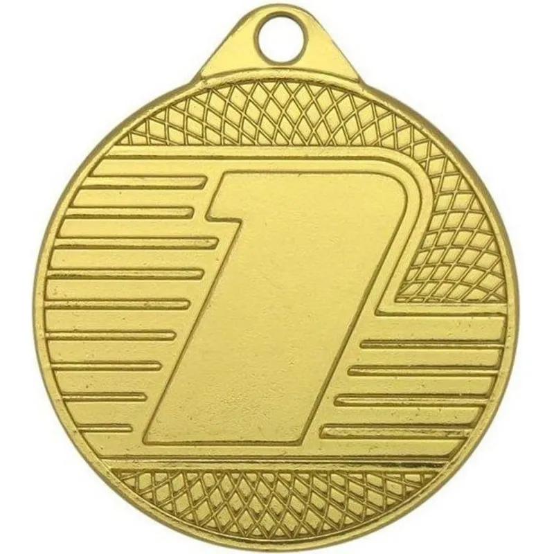 Медаль 1 место 7×7 см отделка под золото (mk401)<br /> <br /> Медаль предназначена для награждения победителей, занявших первое место в спортивных и других конкурсных мероприятиях. Изготовлена из высокопрочного металлического сплава с декоративным покрытием под золото. На аверсе расположена арабская цифра «1», выполненная глянцевым рельефом на матовом фоне. Декор дополнен рельефом из горизонтальных линий и трёх концентрических рядов ромбов. В верхней части предусмотрено дугообразное ушко с круглым отверстием для крепления ленты.<br /> <br /> Диаметр изделия составляет 7 см, толщина — 2 мм.