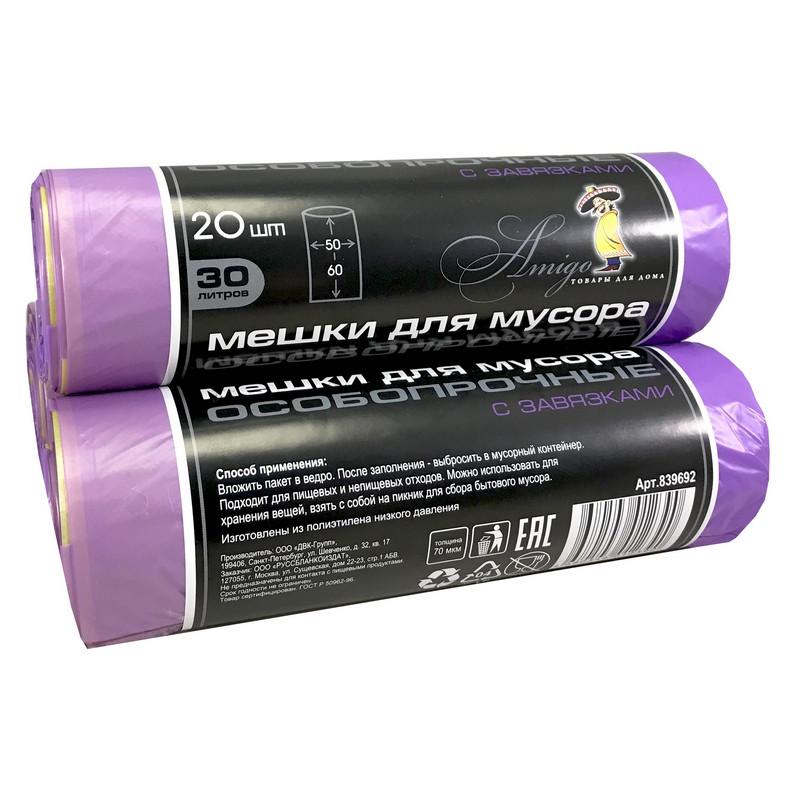 Мешки для мусора 30 л с завязками фиолетовые (ПНД 25 мкм, 20 штук в рулоне). <br> Подходят для легкого пластика и упаковки. Данные пакеты находят широкое применение в домашнем использовании, в офисе, в производственных помещениях и государственных учреждениях (поликлиниках, школах, детских садах), в гостиницах, салонах красоты, фитнес-центрах. С завязками. Не являются ароматизированными и биоразлагаемыми.<br> Упакованы по 20 штук.