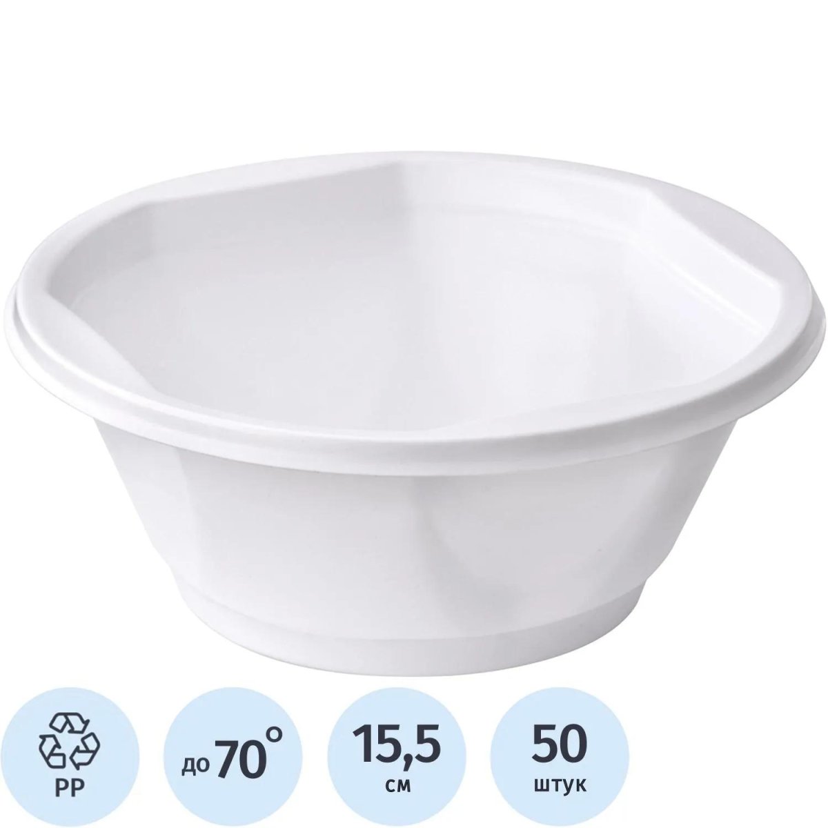 Миска одноразовая пластиковая подходит для подачи супов, горячих блюд и салатов. Её используют в офисных столовых, кафе и заведениях общественного питания. <br>Миска изготовлена из белого полипропилена. Материал безопасен, не выделяет токсичных веществ при нагревании и не способствует развитию бактерий. Изделие выдерживает температуру до +70°С и подходит для использования в микроволновой печи. Мытьё перед применением не требуется.<br>Диаметр миски — 155 мм, объём — 600 мл. <br>В упаковке 50 штук.