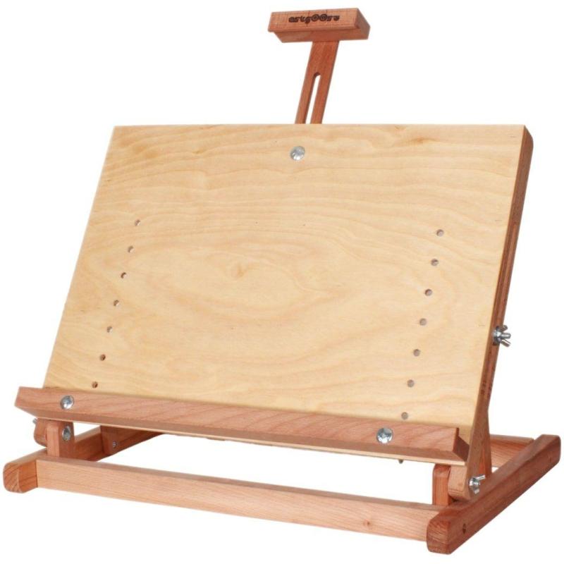 Мольберт настольный серии ARG-16 компании «Туюкан».<br>Небольшой комбинированный настольный мольберт — планшет с подъемной штангой. Предназначен для работы с маленькими холстами, для эскизных работ на бумаге и картоне, а так же для демонстрации картин, фотографий, рисунков и багетов.<br>Мольберт изготовлен из высококачественного бука, который покрыт специальным защитным составом.<br><br>Максимальная высота холста на подрамнике или планшета — 54 см.<br>Выдерживает вес до 3 кг.<br>Дополнительные характеристики:<br>— размер основания: 47.5×33 см;<br>— особенности: мольберт-планшет с подъемной штангой, изменяемой высотой полочки и регулируемым наклоном.