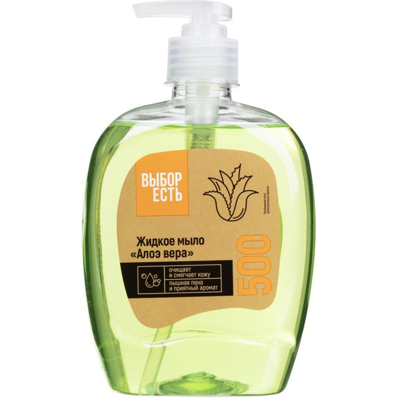 Мыло жидкое Выбор есть Алоэ вера 500 мл<br><br>Назначение: очищает и смягчает кожу. Продукция косметическая гигиеническая моющая по уходу за кожей рук.<br>Состав: Aqua, Sodium Chloride, Sodium Laureth Sulfate, Cocamide DEA, Parfum, DMDM Hydantoin, Methylchloroisothiazolinone, Methylisothiazolinone, C.I. 19140, C.I. 42090.<br>Область применения: использовать по назначению — в быту, кафе, ресторанах, комбинатах общественного питания, лечебно-профилактических, учебных и детских учреждениях.<br>Меры предосторожности:<br>Использовать только по назначению! Хранить в недоступном для детей месте. При попадании мыла в глаза немедленно промыть их чистой водой.<br>Условия хранения:<br>Хранить вдали от пищевых продуктов, нагревательных и осветительных приборов и прямых солнечных лучей при температуре не ниже +5 °С и не выше +25 °С.<br>Срок годности: 24 месяца.