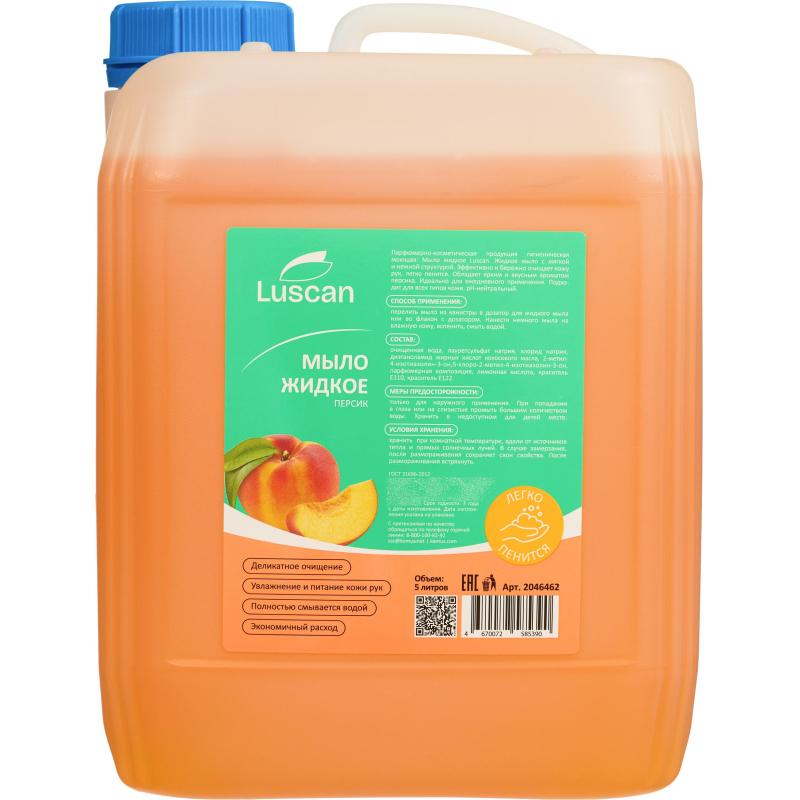 Мыло жидкое косметическое Luscan Персик 5000 мл<br><br>Назначение: жидкое мыло с мягкой и нежной структурой. Эффективно и бережно очищает кожу рук, легко пенится. Обладает ярким и вкусным ароматом персика. Идеально для ежедневного применения. Подходит для всех типов кожи. Ph-нейтральный.<br>Способ применения: перелить мыло из канистры в диспенсер для жидкого мыла или во флакон с дозатором. Нанести немного мыла на влажную кожу, вспенить, смыть водой.<br>Меры предосторожности: только для наружного применения. При попадании в глаза или на слизистые промыть большим количеством воды. Хранить в недоступном для детей месте, при комнатной температуре, вдали от источников тепла и прямых солнечных лучей. В случае замерзания, после размораживания сохраняет свои свойства. После размораживания встряхнуть.<br>Состав: очищенная вода, лауретсульфат натрия, хлорид натрия, диэтаноламид жирных кислот кокосового масла, 2-метил-4-изотиазолин-3-он, 5-хлоро-2-метил-4-изотиазолин-3-он, парфюмерная композиция, лимонная кислота, краситель Е110, краситель Е122.<br>Срок годности: 3 года с даты изготовления.