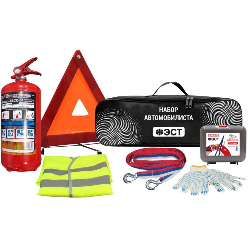 Набор автомобилиста Фэст Авто (1463) — это комплект из шести предметов, необходимых в случае возникновения непредвиденных или аварийных ситуаций на дороге.<br><br>Основной состав набора автомобилиста включает все необходимое для прохождения техосмотра: <br>• аптечка первой помощи дорожная «ФЭСТ» для оказания само- и взаимопомощи;<br>• огнетушитель порошковый металлический с манометром ОП-2(з);<br>• знак аварийной остановки с мягким внутренним слоем в пластиковом футляре;<br>• трос буксировочный с крюками (3,5 т, 4 м); <br>• перчатки с ПВХ;<br>• жилет сигнальный, размер XL;<br>• сумка-футляр для хранения и переноски размером 470×135×145 мм.<br>Все комплектующие, входящие в состав набора автомобилиста, имеют необходимые лицензии и сертификаты.