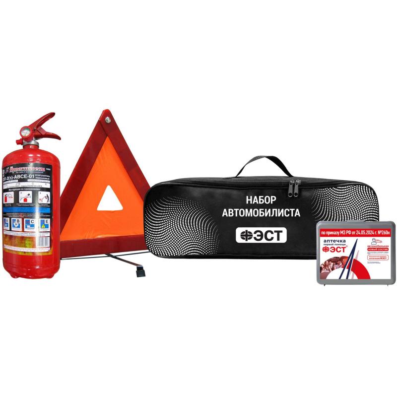 Набор автомобилиста Фэст На техосмотр (3867) — это комплект из четырех предметов, необходимых в случае возникновения непредвиденных или аварийных ситуаций на дороге.<br><br>Основной состав набора автомобилиста включает все необходимое для прохождения техосмотра:<br>• Аптечка для оказания первой помощи пострадавшим в дорожно-транспортных происшествиях (автомобильная) «ФЭСТ», приказ 260н<br>• Огнетушитель порошковый металлический с манометром ОП-2(з)<br>• Знак аварийной остановки с мягким внутренним слоем в пластиковом футляре;<br>• Сумка-футляр для хранения и переноски размером 470×135×145 мм.<br>Все комплектующие, входящие в состав набора автомобилиста, имеют необходимые лицензии и сертификаты.