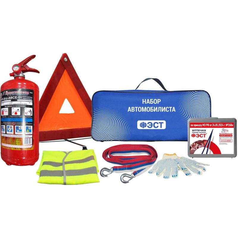 Набор автомобилиста Фэст Универсал-3 (3875) — это комплект из семи предметов, необходимых в случае возникновения непредвиденных или аварийных ситуаций на дороге.<br><br>Основной состав набора автомобилиста включает все необходимое для прохождения техосмотра:<br>• Аптечка для оказания первой помощи пострадавшим в дорожно-транспортных происшествиях (автомобильная) «ФЭСТ», приказ 260н<br>• Огнетушитель порошковый металлический с манометром ОП-2(з)<br>• знак аварийной остановки с мягким внутренним слоем в пластиковом футляре;<br>• Трос буксировочный с крюками (3,5 т, 4 м)<br>• Жилет сигнальный, размер XL;<br>• Перчатки с ПВХ<br>• Сумка-футляр для хранения и переноски размером 475×200×145 мм.<br>Все комплектующие, входящие в состав набора автомобилиста, имеют необходимые лицензии и сертификаты.