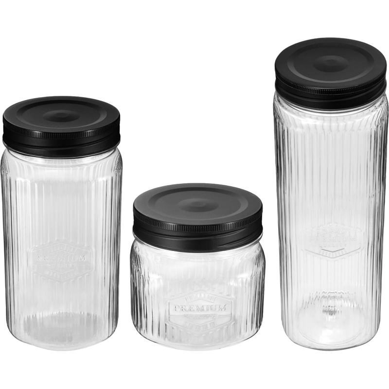 Банки для сыпучих продуктов Phibo Premium пластиковые 1 штука 0.6 л, 1 штука 1.3 л, 1 штука 2 л <br><br>Стильные банки Phibo с вертикальным рельефом и эмбоссингом (эффектом тиснения) из коллекции Premium — это удобное и практичное решение для хранения сыпучих продуктов. <br>Корпус банок прозрачный, как стекло, но в то же время лёгкий и прочный. Благодаря своей изысканной форме, банки соответствуют современным тенденциям в области дизайна и украсят интерьер любой кухни. <br>Коллекция банок состоит из трёх наиболее востребованных объёмов: 0.6 л (высота 9.5 см), 1.3 л (высота 19 см) и 2 л (высота 28.3 см).<br>Винтовая крышка сохранит свежесть продуктов и не пропустит влагу или посторонние запахи.<br>Температурный режим использования: от −10°C до +50°C. <br>Банки производятся из высококачественного пищевого пластика, подлежат вторичной переработке.