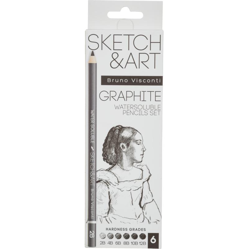 Набор карандашей чернографитных художественных Sketch&Art заточенные четырехгранные, корпус светло-серый (6 штук).<br /> <br /> Набор водорастворимых чернографитовых карандашей Sketch&Art включает 6 штук с твёрдостью грифеля от 2B до 12B. Предназначен для создания рисунков и эскизов. Можно использовать в сухом виде на мокрой или сухой бумаге, а при необходимости размыть изображение для придания различных эффектов.<br /> <br /> Карандаши изготовлены из термообработанной липы, что обеспечивает прочность корпуса. Прочный грифель выдерживает сильный нажим, не смещается при затачивании. Грифель крепится в корпусе при помощи эластичного дисперсионного клея, устойчив к деформациям, не крошится и не ломается. Длина корпуса — 177 мм, диаметр — 8 мм, диаметр грифеля — 4 мм.<br /> <br /> Карандаши имеют четырёхгранный профиль и светло-серый цвет корпуса. Заточены и готовы к использованию. Отсутствие ластика делает их компактными. Производятся в Китае. Четырёхгранный корпус обеспечивает удобство захвата. Грифель легко затачивается и не крошится при заточке.<br /> <br /> Подходит для профессионалов и любителей, занимающихся рисованием и черчением. Упакованы в картонную коробку с покрытием Soft Touch.