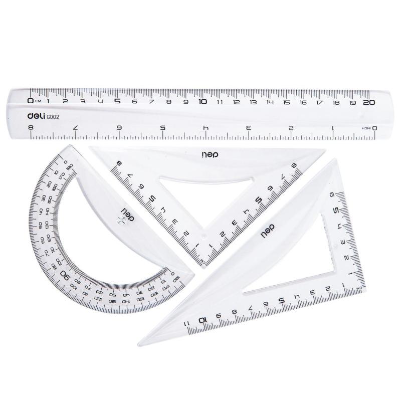 Набор чертёжный Deli EG00412 прозрачный (линейка, транспортир, 2 треугольника)<br /> <br /> Набор геометрический чертежный Deli Pioneer является незаменимым помощником при чертежных работах в образовательных учреждениях, офисах, а также дома. Выгодный набор линеек для черчения изготовлен из высококачественного, плотного и прочного пластика. В набор линеек входит: линейка 20 см, треугольник 11 см и 8 см, транспортир 12 см. Благодаря небольшой длине, набор поместится в любой пенал. Корпус линеек представлен в прозрачном дизайне. Нанесенная четкая разметка под воздействием ультрафиолетовых лучей позволяет не только производить точные измерения, но и делает линейки устойчивыми к царапинам. Дизайн легкого захвата позволяет быстро взять линейки со стола — кромки линеек на нижней стороне имеют скос, поэтому при нажатии на кромку они опускаются, а все изделие приподнимается над столом. Это и есть дизайн для легкого захвата. Края и углы гладкие, не царапаются. Набор линеек канцелярских ударопрочных — это идеальный презент и незаменимый атрибут ученика. Набор чертежный для школы поставляется в пакете с европодвесом.