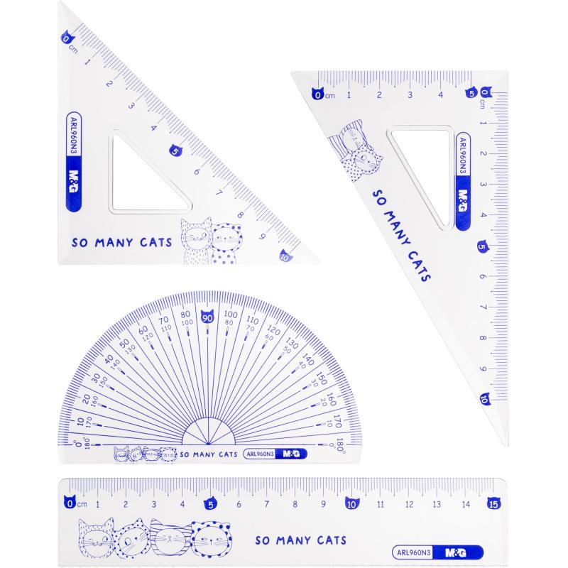Набор чертёжный M&G So Many Cats прозрачный (линейка, транспортир, 2 треугольника)<br> <br> Набор геометрический чертёжный M&G So Many Cats является незаменимым помощником при чертёжных работах в образовательных учреждениях, офисах, а также дома. Выгодный набор линеек для черчения изготовлен из высококачественного, плотного и прочного пластика. В набор линеек входит: линейка 15 см, 2 угольника 45° и 60°, транспортир 180°. Благодаря небольшой длине, набор поместится в любой пенал. Корпус линеек представлен в прозрачном дизайне. Нанесённая чёткая разметка под воздействием ультрафиолетовых лучей позволяет производить точные измерения. Набор чертёжный поставляется в ПВХ конверте (цвет конверта в ассортименте).