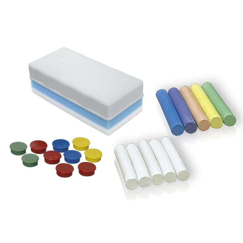 Набор принадлежностей 2×3 для меловой доски включает в себя: <br>— губка для мела; <br>— магниты; <br>— 2 набора мела (белый и цветной).<br>Надписи легко стираются губкой, не оставляя следов. Набор станет незаменимым атрибутом во время проведения презентаций, совещаний и переговоров.