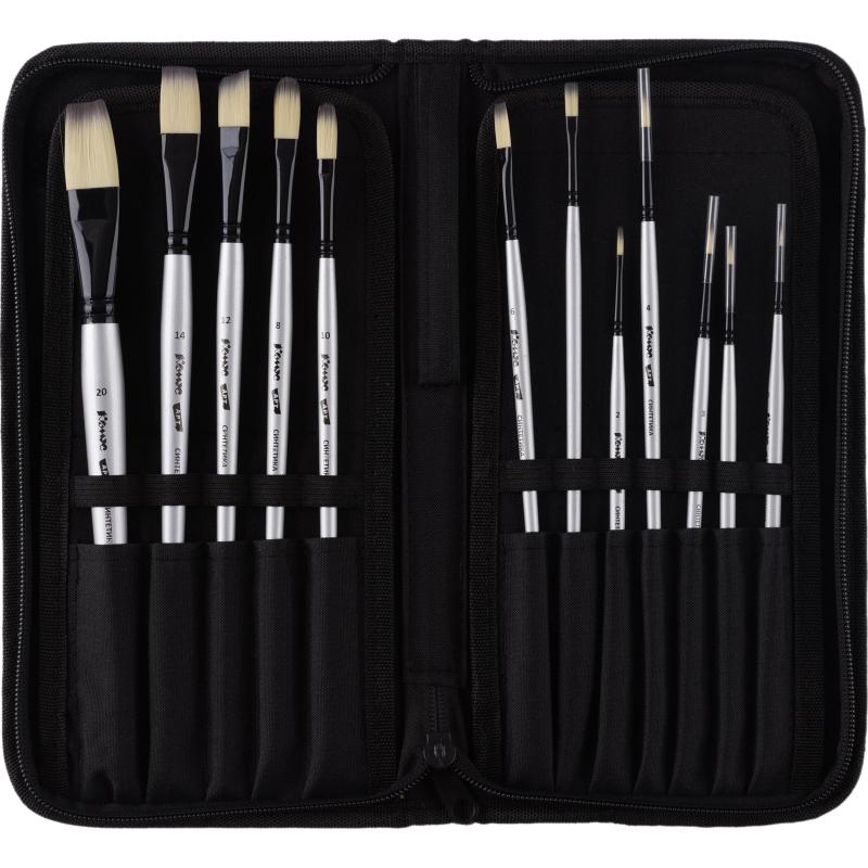 Набор художественных кистей Комус Арт — это отличный выбор для художников и любителей акварельной живописи, который позволит создавать яркие и выразительные работы. <br>Особенности набора: синтетический ворс — средней жесткости, эластичный, обеспечивает плавное и точное нанесение краски, а значит — ровные и красивые штрихи. 12 размеров: в набор входят кисти размеров 0, 2, 3, 4, 6, 8, 10, 12, 14 и 20, что позволит вам работать с разными деталями и форматами. <br>Круглая, плоская, овальная и скошенная формы позволяют добиваться разных типов изображений и работать в разных техниках. <br>Прочные ручки изготовлены из дерева, что обеспечивает удобный хват и прочность кисти. <br>Универсальность: кисти набора Комус подходят для работы с разными видами акварельных красок. <br>Идеальны для использования в художественных училищах, творческих кружках или же просто в домашних условиях. В комплект входит черный кейс.