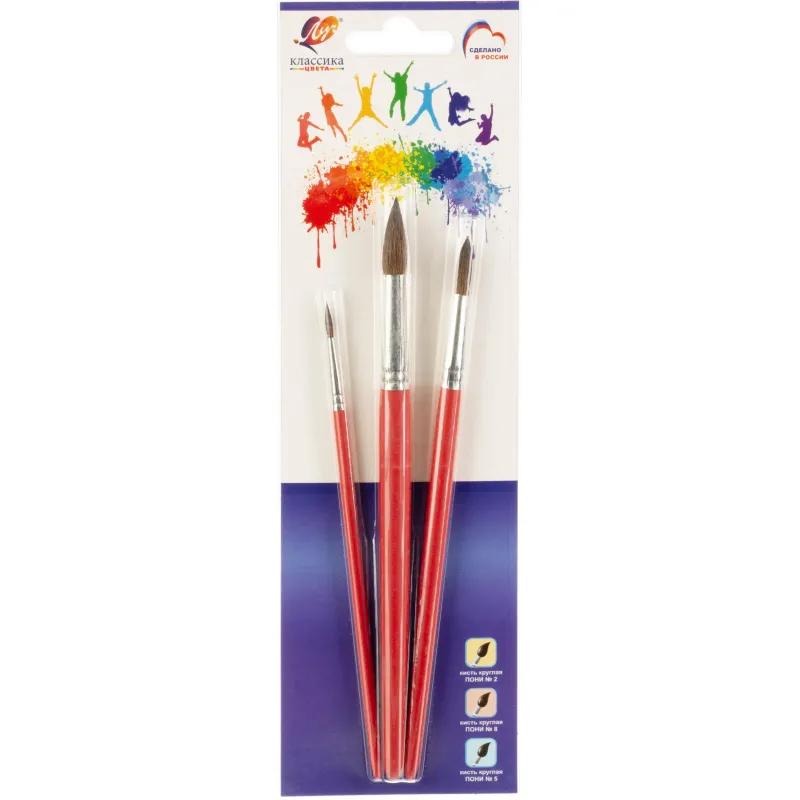 <br><br>Набор кистей Луч Классика цвета пони (3 штуки в наборе)<br><br>Набор кистей из натурального волоса пони предназначен для рисования акварелью, гуашью, темперой и акрилом. Мягкий и плотный пучок хорошо удерживает краску и равномерно передаёт её на поверхность, обеспечивая чистые заливки и аккуратные линии. Благодаря округлой форме кисти подходят как для работы по фону, так и для прорисовки деталей. В набор входят круглые кисти № 2, 5 и 8. Каждая кисть собирается вручную и оснащена металлической обоймой с двойной обичайкой, которая надёжно соединяет все элементы. Деревянная ручка красного цвета тщательно отшлифована и покрыта безопасным составом, что делает работу комфортной. Изделие упаковано в коррекс с красочной этикеткой и европодвесом.