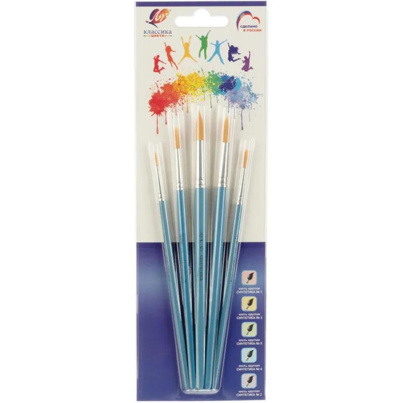 <br><br>Набор кистей Луч Классика цвета синтетика (5 штук в наборе)<br><br>Набор кистей с пучками из синтетического волокна подходит для рисования акварелью, гуашью, темперой и акрилом. Волокно средней упругости обеспечивает точный и контролируемый мазок, позволяя создавать как тонкие линии и штрихи, так и более насыщенные заливки. В комплект входят круглые кисти № 1, 2, 3, 4 и 5, что делает набор универсальным для выполнения различных художественных задач. Каждая кисть собирается вручную и оснащена металлической обоймой с двойной обичайкой. Деревянная ручка синего цвета отшлифована и пропитана безопасным составом, что делает работу кистью удобной. Изделие упаковано в коррекс с яркой этикеткой и европодвесом.