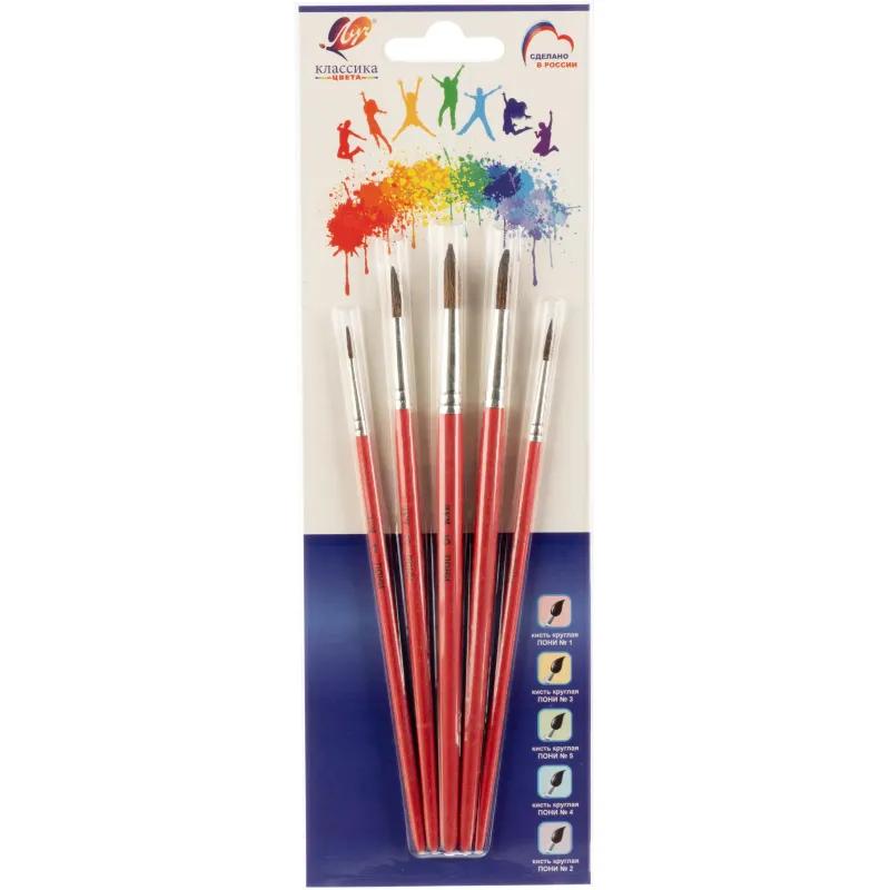 <br><br>Набор кистей Луч Классика цвета пони (5 штук в наборе)<br><br>Набор кистей с пучком из натурального волоса пони предназначен для рисования акварелью, гуашью, темперой и акрилом. Мягкий, но плотный ворс равномерно впитывает краску и плавно передаёт её на бумагу, что делает кисти удобными как для заливки фона, так и для прорисовки тонких линий. В набор входят круглые кисти № 1, 2, 3, 4 и 5, позволяющие работать с разными по величине деталями. Пучки формируются вручную и закреплены металлическими обоймами с двойной обичайкой. Ручки из натурального дерева имеют красную окраску, тщательно отшлифованы и обработаны безопасным составом. Кисти упакованы в коррекс с красочной этикеткой и европодвесом.