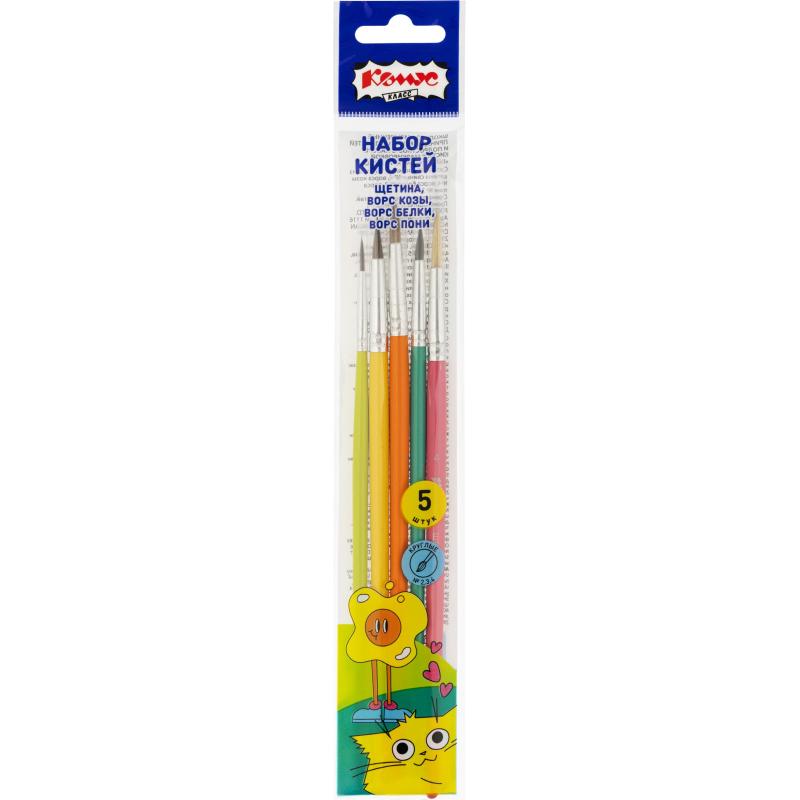 Набор кистей Комус Класс Максики щетина/коза/белка/пони (5 штук в наборе)<br><br>Набор кистей для рисования включает пять круглых кистей с различными типами пучков. Кисти из щетины свиньи под номером 4 подходят для работы с акрилом и маслом — они прочные, упругие и хорошо распределяют краску. Кисти из волоса козы (№ 4), белки (№ 3) и пони (№ 2 и № 4) предназначены для работы с акварелью и гуашью. Эти материалы обеспечивают мягкое нанесение, хорошую впитываемость и плавные цветовые переходы.<br><br>Ручки изготовлены из дерева и удобны для удержания во время работы. Кисти универсальны и подходят для разных техник и задач.